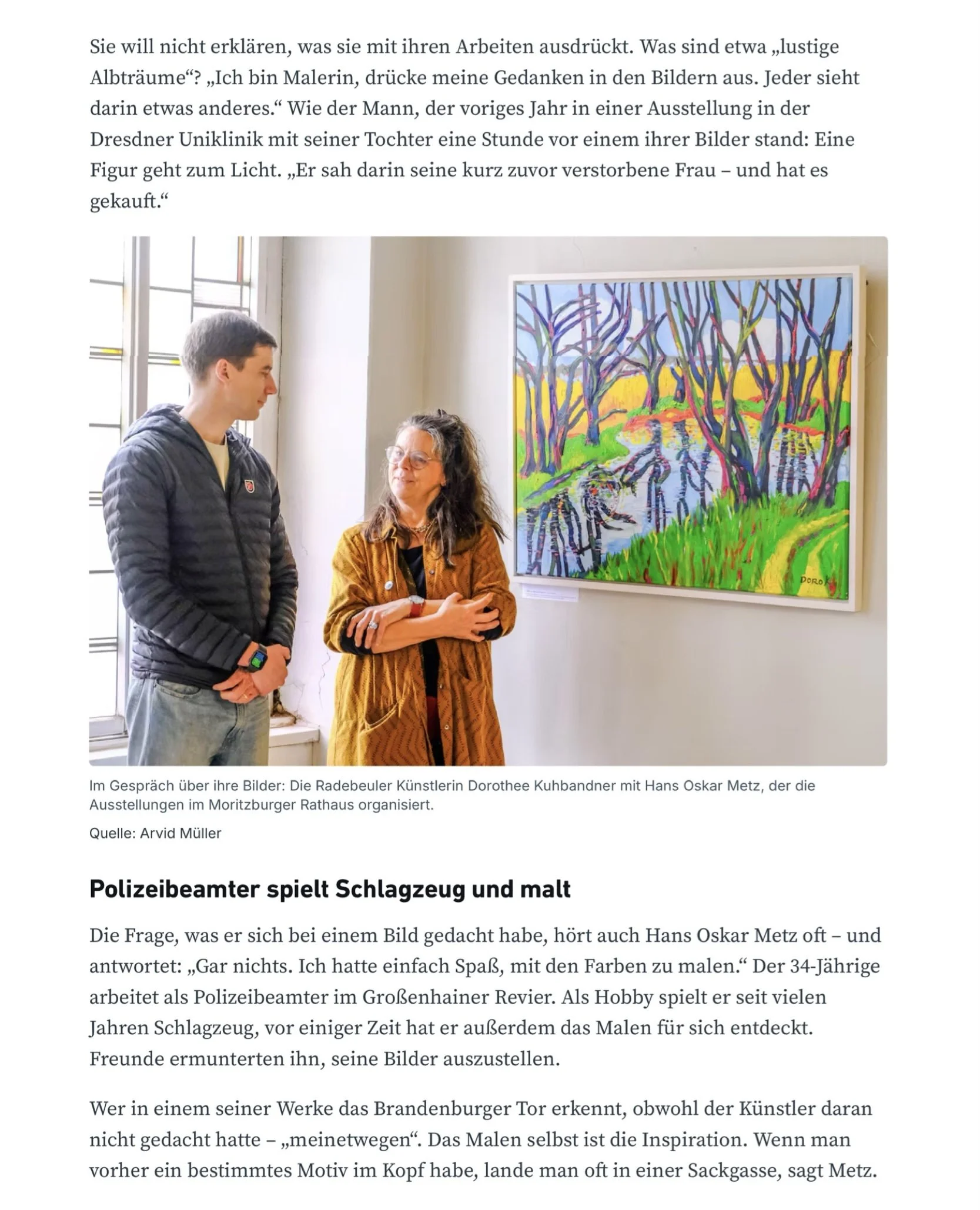 Hans-Oskar Metz ist nicht nur Maler, sondern auch Polizist und Musiker – eine ungewöhnliche Kombination, die zeigt, wie vielseitig seine Kreativität ist. Im Dienst achtet er darauf, dass alles nach Vorschrift läuft, aber auf seiner Leinwand gibt es keine Regeln, nur künstlerische Freiheit. In seinem Moritzburger Atelier fließen dann Farben, es entstehen Strukturen und neue Dimensionen formen sich. Seine Bilder erzählen keine festen Geschichten, sie geben uns Raum, selbst auf Entdeckungsreise zu gehen.