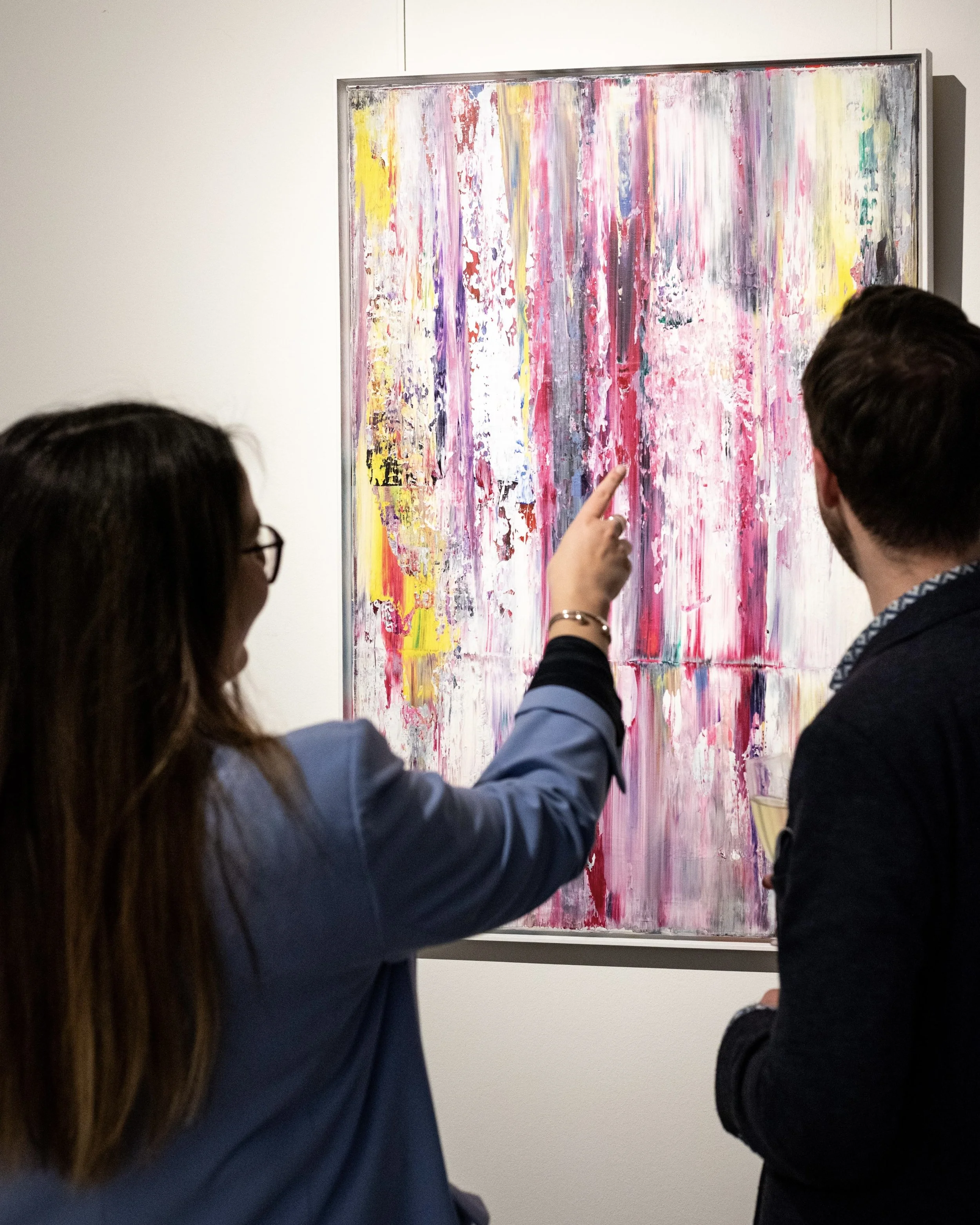Inspiriert von Künstlern wie Gerhard Richter, Josh Jensen oder Lucas Thorik lädt Hans-Oskar Metz uns ein, eine eigene Sichtweise zu finden. Angefertigt mit einer Vielzahl von Techniken und Materialien – von Acrylfarbe bis Strukturpaste, von Malspachtel bis Fensterabzieher – sprechen seine abstrakten Kompositionen eine universelle Sprache, die jeder von uns auf seine Weise verstehen kann. In jedem Werk steckt somit auch immer eine Einladung, Neues zu entdecken und sich darauf einzulassen. Und dass, wie Sie sehen, in ganz unterschiedlichen Formaten Größen.